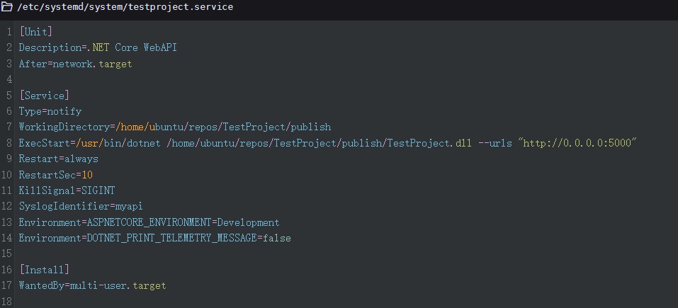 ExecStart=/usr/bin/dotnet /home/ubuntu/repos/TestProject/publish/TestProject.dll --urls "http://0.0.0.0:5000"